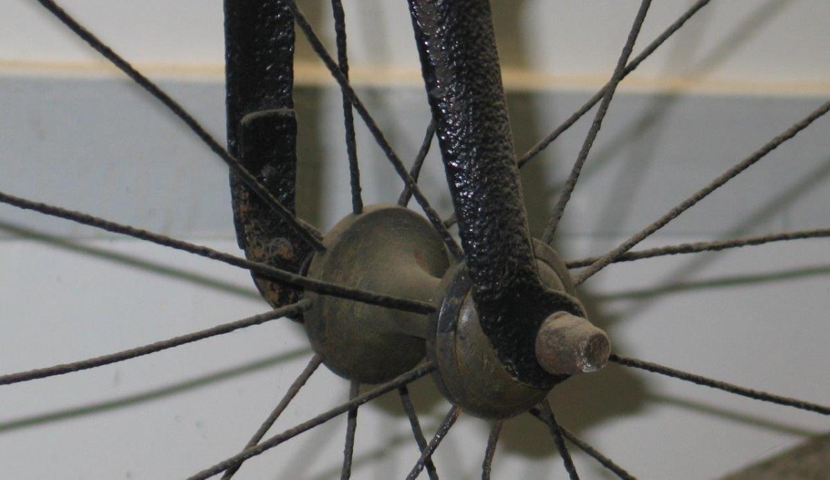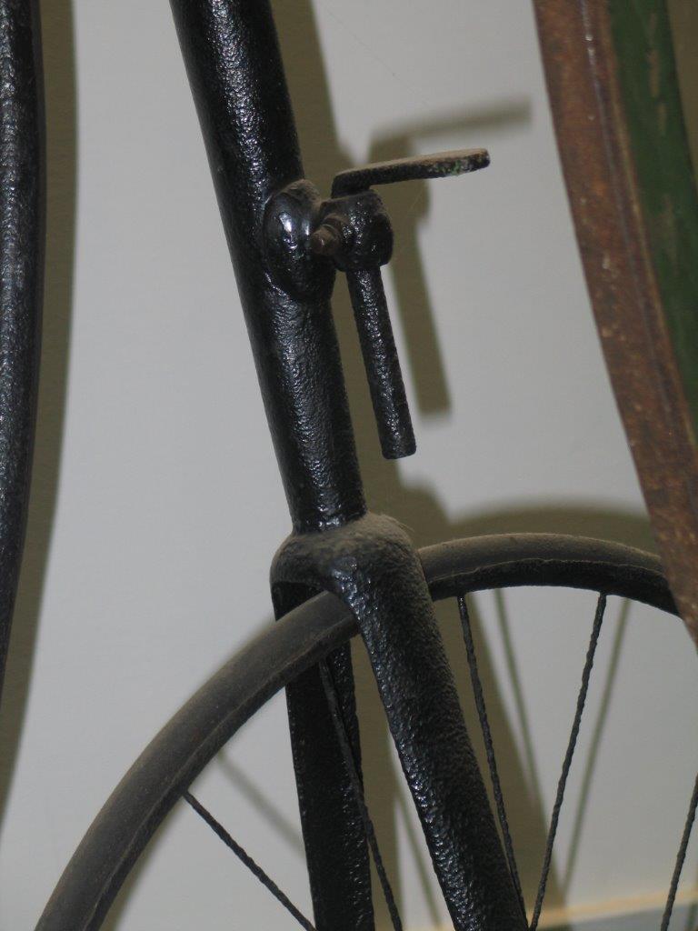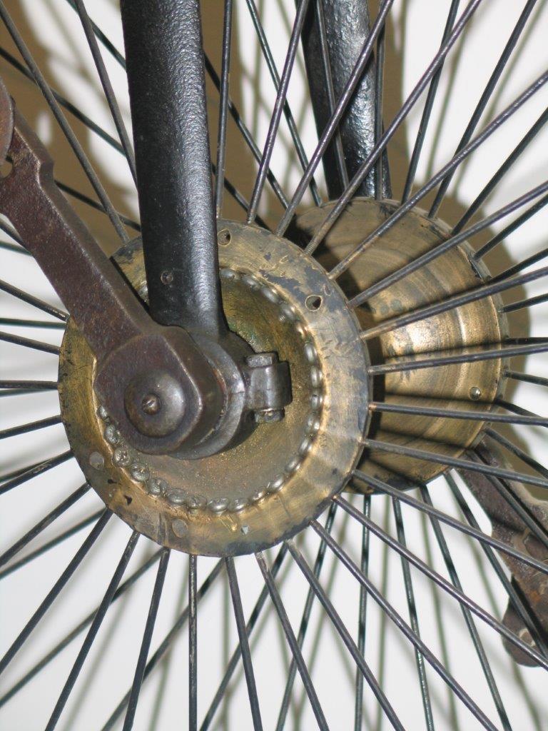 During the years, I managed to identify two main Howe-models. The first one, built from approximately 1880-1883, had a very distinctive step. The form of the cranks is also a way to identify them. The earliest bicycles had locknut spokes (Sturmey's Handbook tells us this is still the case in 1881). Later customers could choose between direct spokes and locknut spokes (source: Catalogue 1884). Front bearings have giant oilers (lost in most of the cases) rear hub has cone or ball bearings.